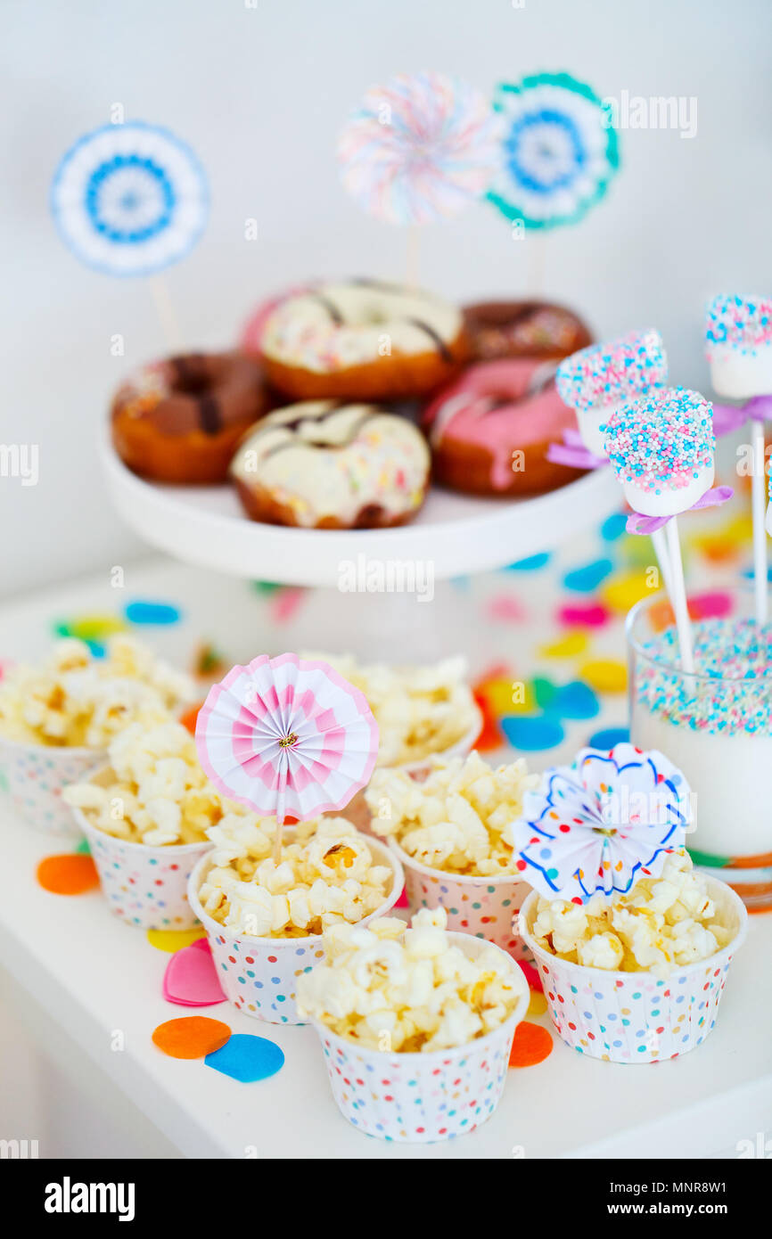 Donuts And Other Sweets On Dessert Table At Kids Birthday
