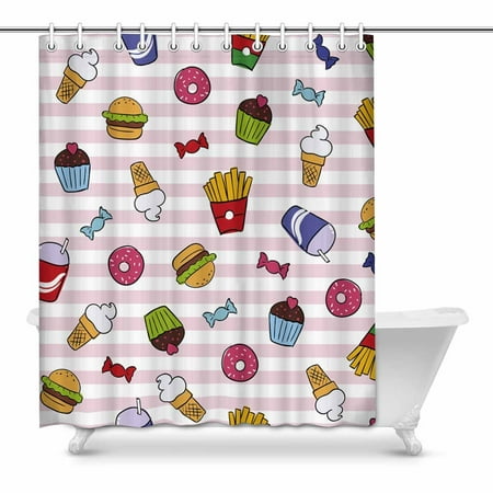 Mkhert Funny Fast Food On Stripes Franch Fries Ice Cream Cake Donut And Hamburger Home Decor Waterproof Polyester Bathroom Shower Curtain Bath 60x72