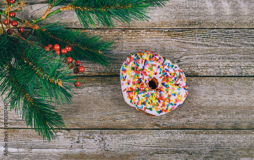 Closeup Of Christmas Tree Decorations With Sweet Donut